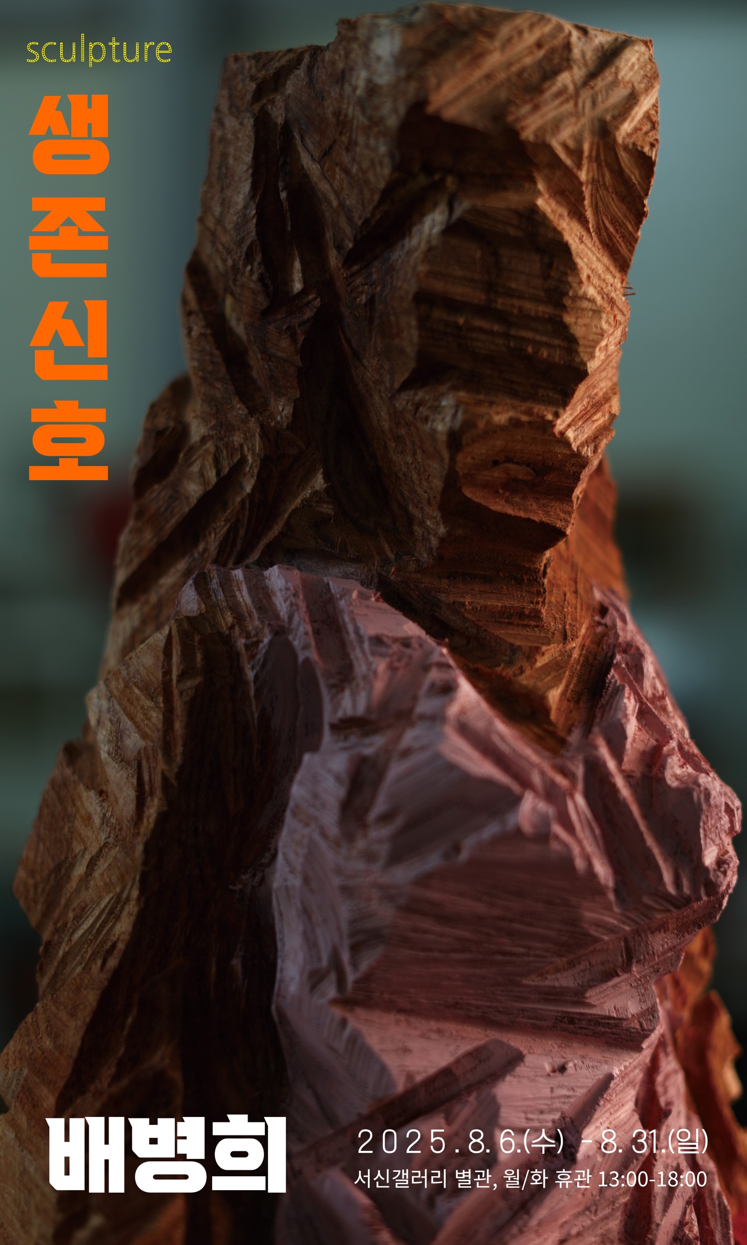 이번 전시에서는 파손의 흔적을 서사적 요소로 수용했다. 체인톱의 과격한 절단과 공격적인 조각 행위를 통해 현대 도시문명이라는 거대한 시스템 안에서 인간이 겪는 불안정성, 그리고 그로부터 필연적으로 발산되는 필사적이면서도 강렬한 생존 신호를 시각적으로 형상화했다. 파손과 버팀이 상호 공명하는 이번 작품을 통해 도시의 균열 사이로 각자의 생존 신호를 발견하고 서로의 신호에 응답하는 계기가 되길 바란다. - 배병희