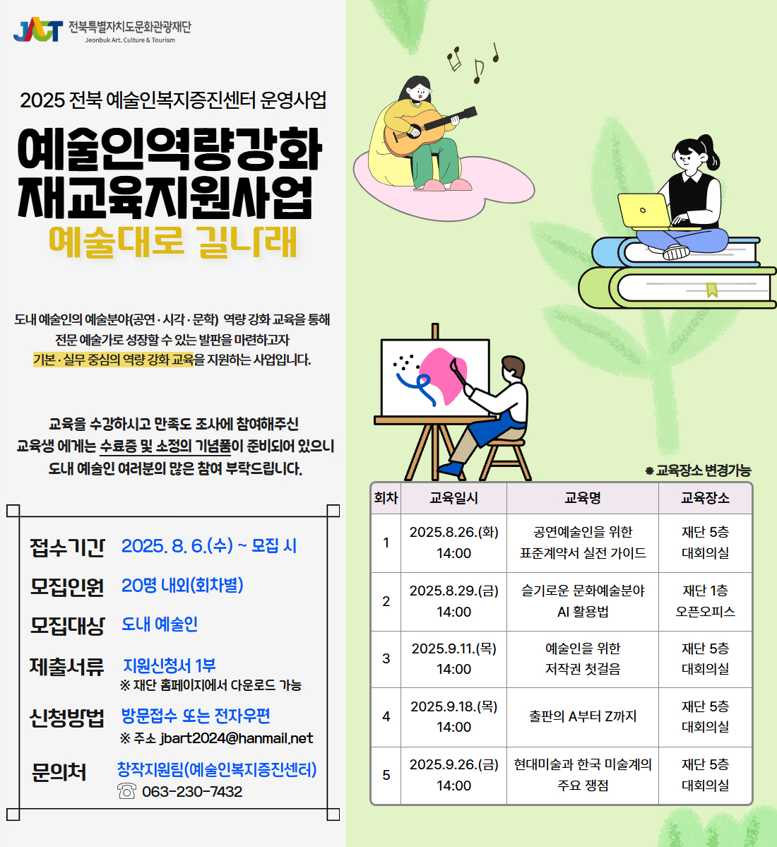 | 공모명 | 2025 예술인역량강화재교육지원사업 <예술대로 길나래> 교육생 모집 공고 |