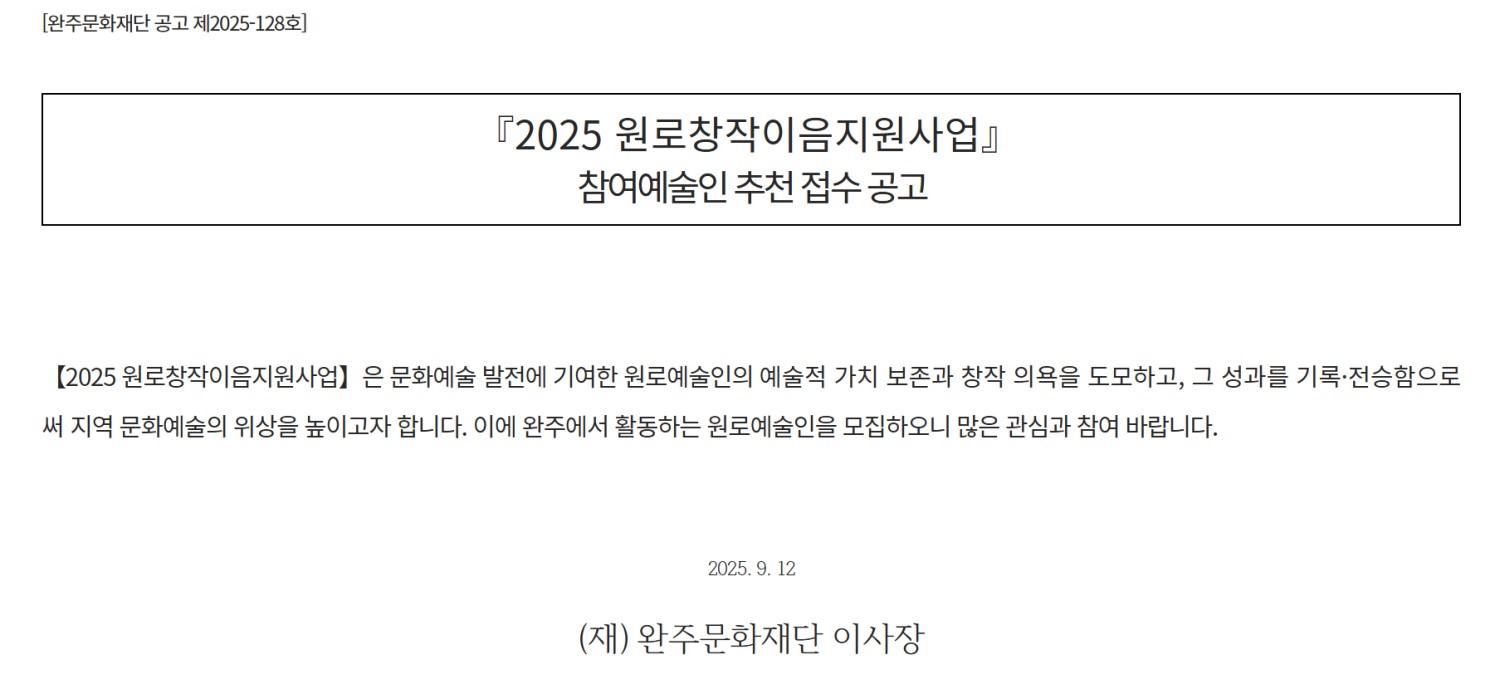 | 공모명 | 2025 원로창작이음지원사업 참여예술인 추천 접수 공고 |