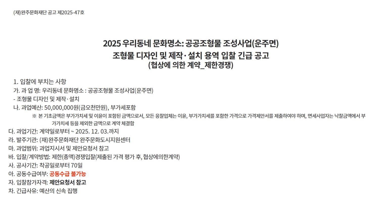 - 다음글2025 우리동네 문화명소: 공공조형물 조성사업(봉동읍) 조형물 디자인 및 제작·설치 용역 입찰 25.09.16