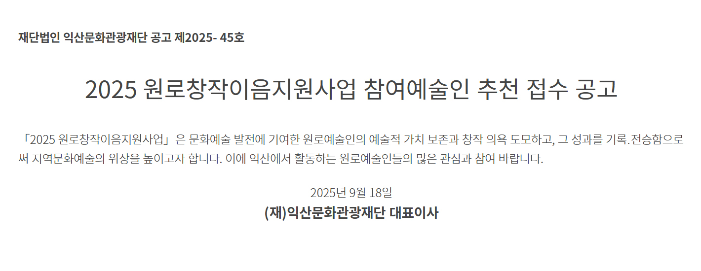 | 공모명 | <익산>2025 원로창작이음지원사업 참여예술인 모집 공고 |