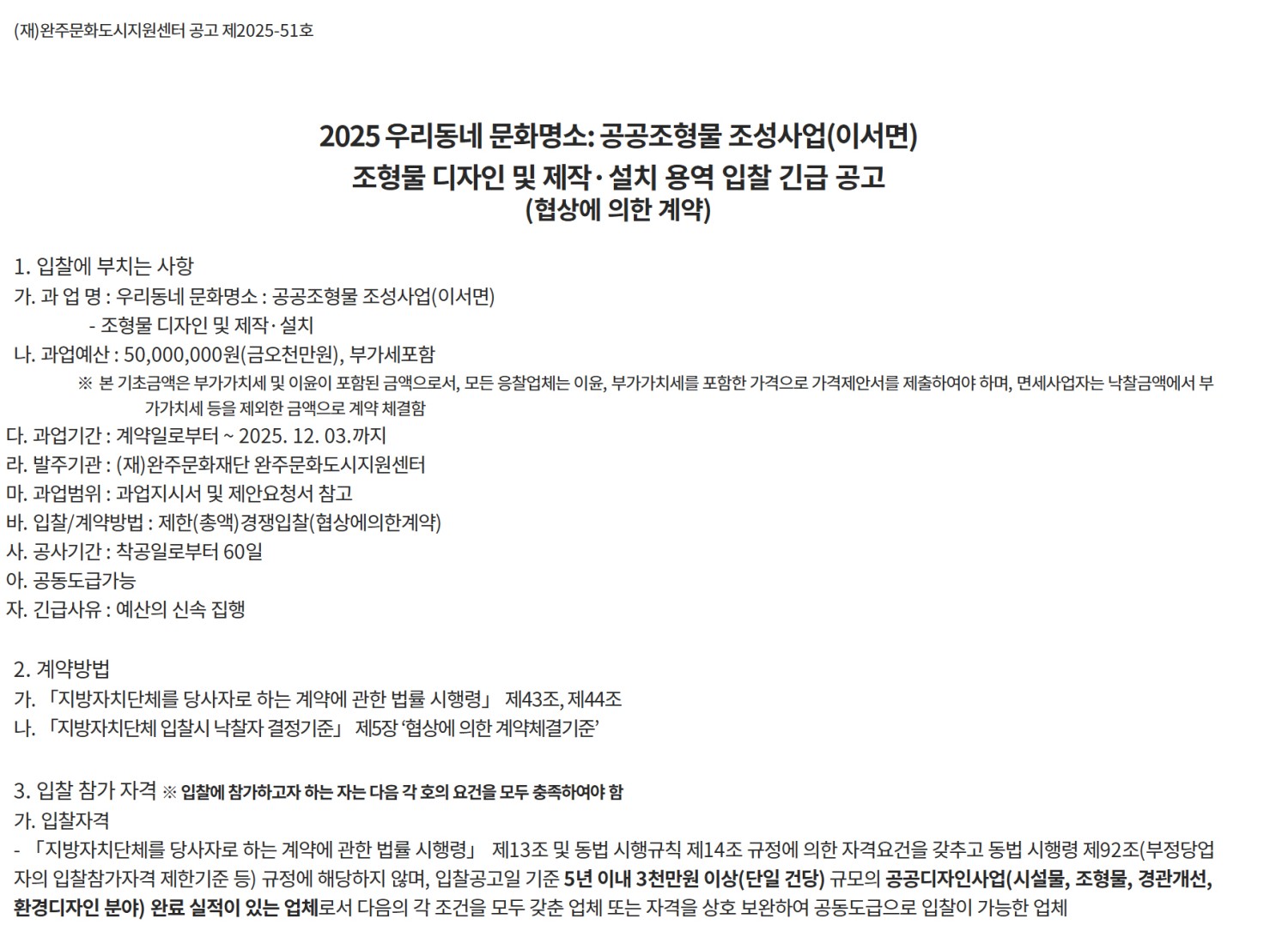 | 공모명 | [2025 문화도시] 2025 우리동네 문화명소 공공조형물 조성사업(이서면) 조형물 디자인 및 설지 제작 용역 입찰 |