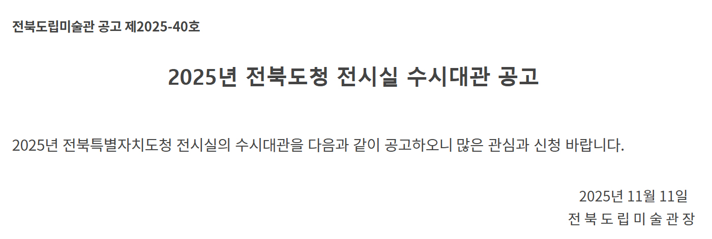 | 공모명 | 2025년 전북도청 전시실 수시대관 공고 |