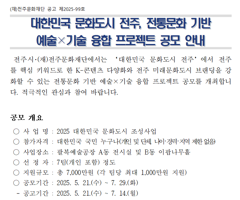 | 공모명 | [공고] 대한민국 문화도시 전주, 전통문화 기반 예술×기술 융합 프로젝트 공모 |