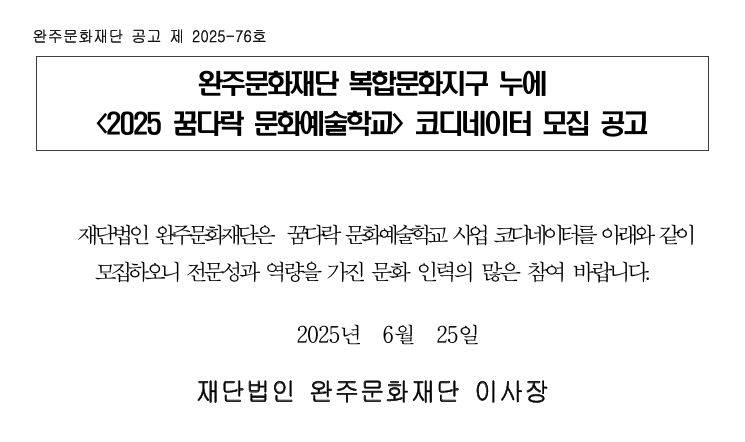 | 공모명 | 2025 완주문화재단 복합문화지구 누에 <2025 꿈다락 문화예술학교> 코디네이터 모집 공고 |