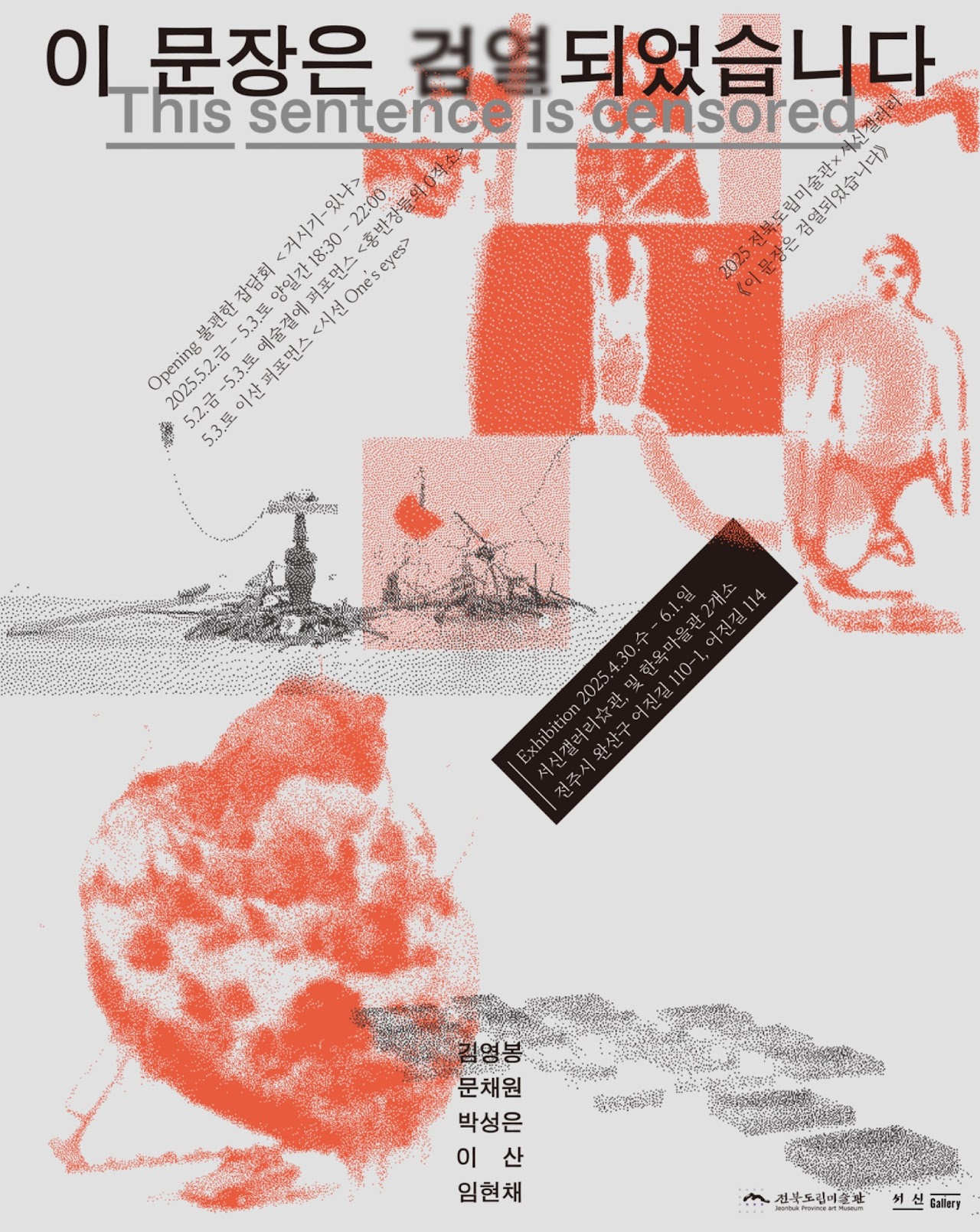 전시 기획 의뢰를 통해 제시된 키워드는 두 가지였다. 관계미학과 전북미술의 묵시적 태도. 우리는 전시를 통해 검열되었다고 여겨지는 문장들이 과연 검열된 것인지 질문해 본다. 검열되었을지 모른다. 그러나 목에 핏대를 세우고 낮은 목소리로 말하고 있다. 절대로 ‘소리 없는 아우성’만은 아니다.