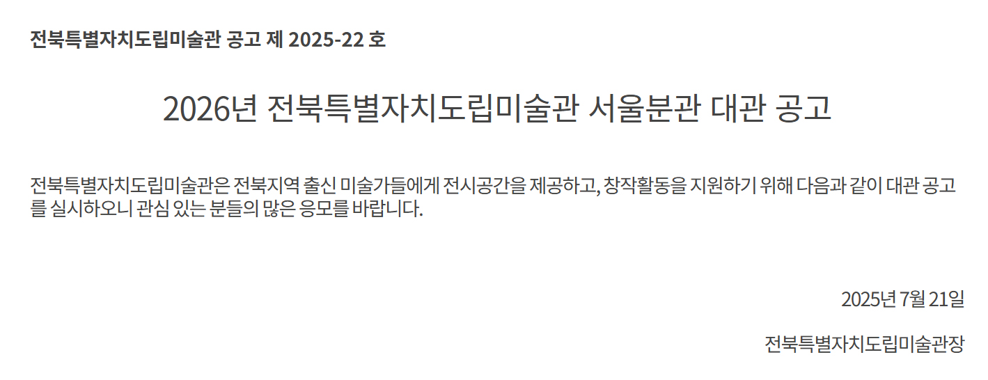 | 공모명 | 2026년 전북특별자치도립미술관 서울분관 대관 공고 |