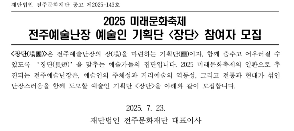| 공모명 | 2025 미래문화축제 전주예술난장 예술인 기획단 <장단> 참여자 모집 |