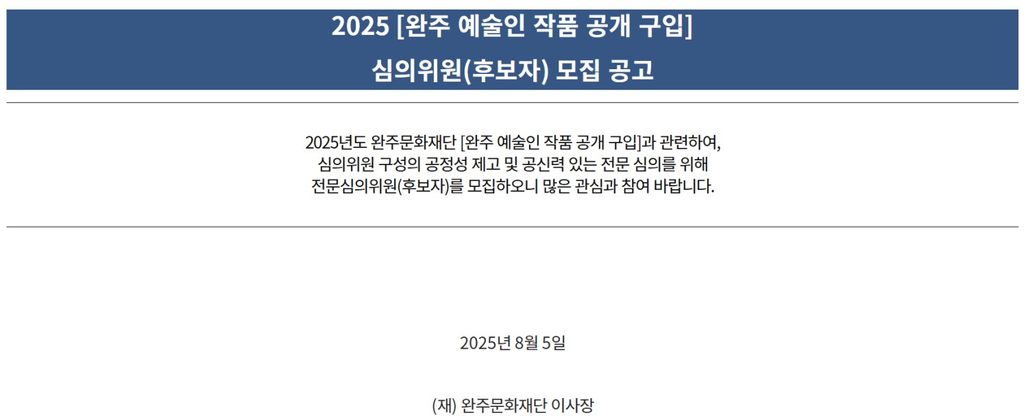 | 공모명 | 2025 [완주 예술인 작품 공개 구입] 심의위원(후보자) 모집 공고 |