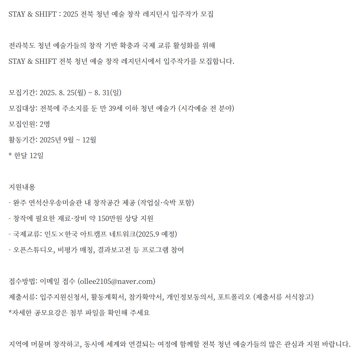 | 공모명 | STAY & SHIFT : 2025 전북 청년 예술 창작 레지던시 입주작가 모집 |