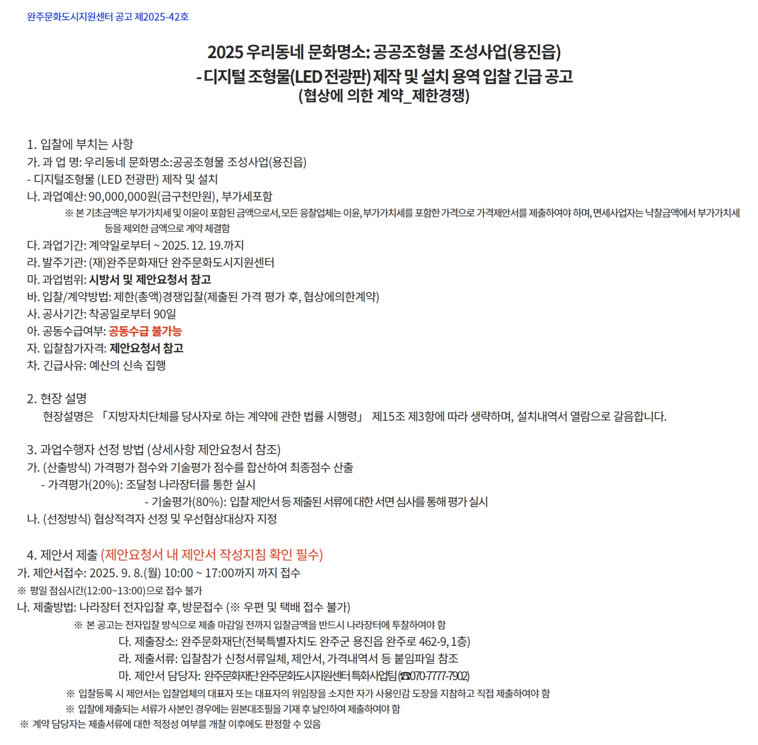 | 공모명 | [2025 문화도시] 2025 우리동네 문화명소: 공공조형물 조성사업(용진읍) - 디지털 조형물(LED 전광판) 제작 및 설치 용역 입찰 공고 |