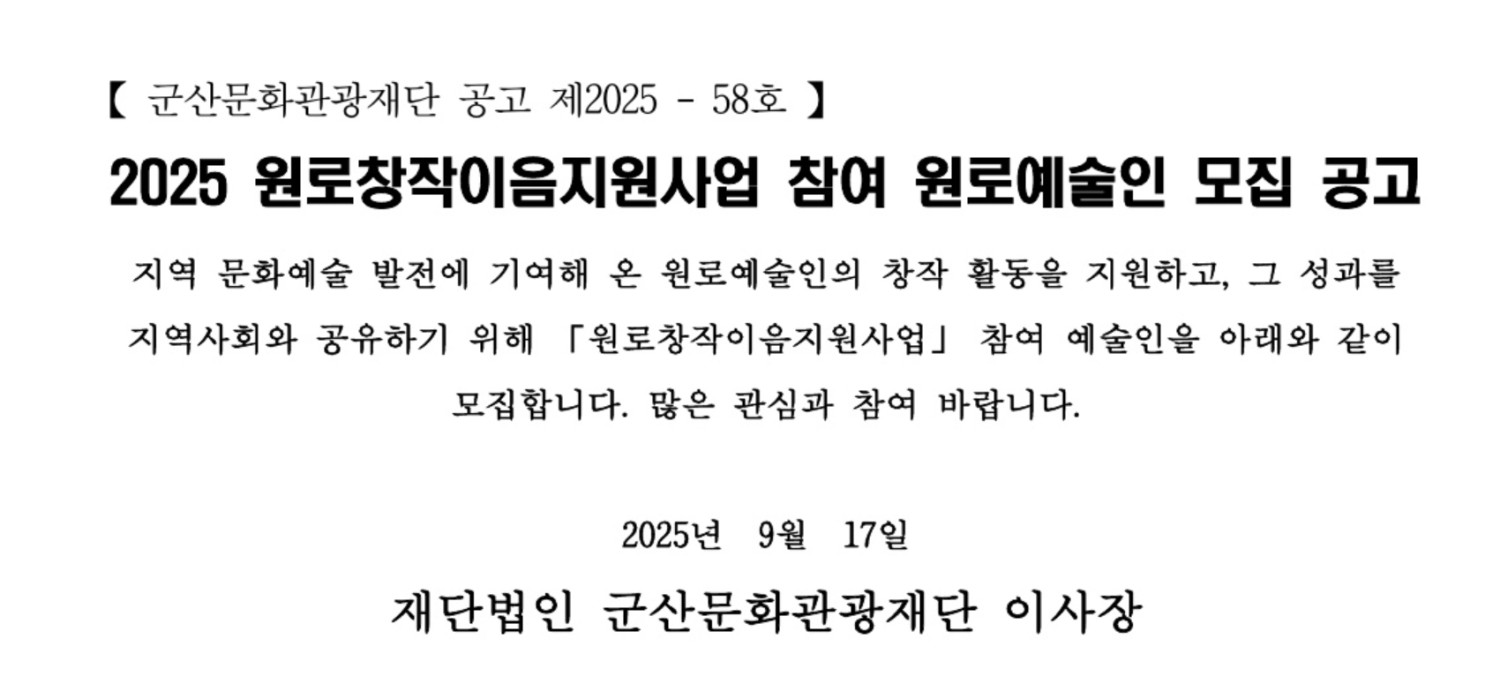 | 공모명 | <군산>2025 원로창작이음지원사업 참여 원로예술인 모집 |