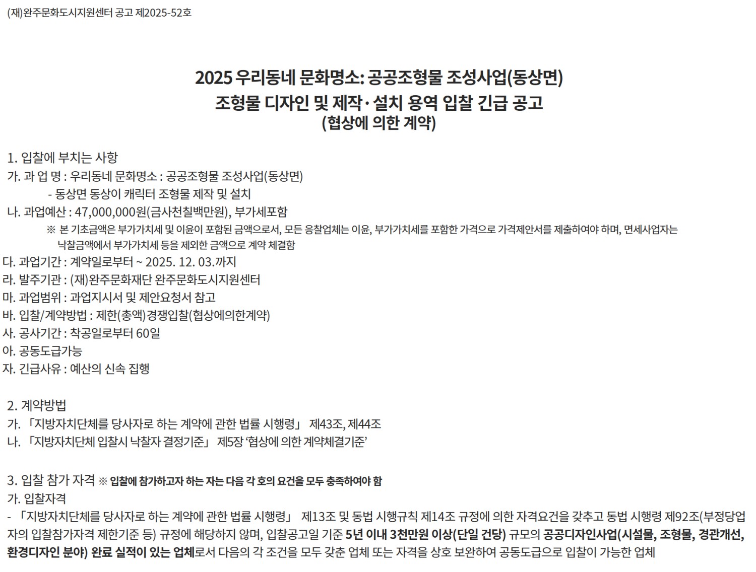 | 공모명 | [2025 문화도시] 2025 우리동네 문화명소 공공조형물 조성사업(동상면) 조형물 디자인 및 설지 제작 용역 입찰 |