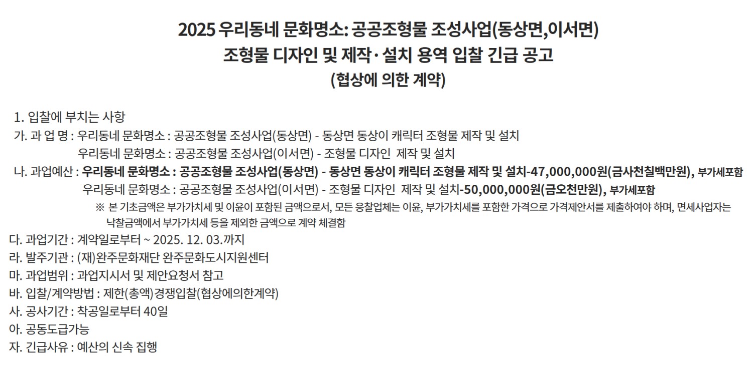 | 공모명 | 2025 우리동네 문화명소 공공조형물 조성사업(동상면,이서면) 조형물 디자인 및 설지 제작 용역 입찰 |