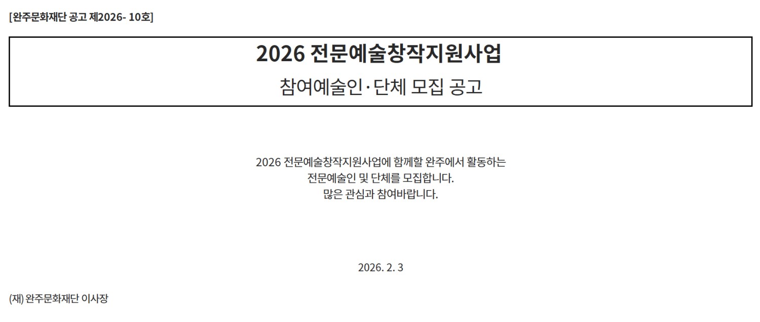 | 공모명 | 2026 전문예술창작지원사업 참여예술인·단체 모집 공고 |