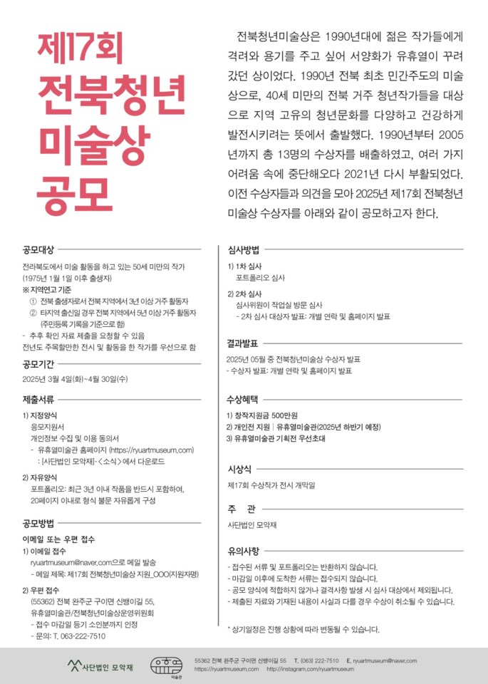 전북청년미술상은 1990년대에 젊은 작가들에게 격려와 용기를 주고 싶어 서양화가 유휴열이 꾸려갔던 상이었다. 1990년 전북 최초 민간주도의 미술상으로, 40세 미만의 전북 거주 청년작가들을 대상으로 지역 고유의 청년문화를 다양하고 건강하게 발전시키려는 뜻에서 출발했다. 1990년부터 2005년까지 총 13명의 수상자를 배출하였고, 여러 가지 어려움 속에 중단해오다 2021년 다시 부활되었다. 이전 수상자들과 의견을 모아 2025년 제17회 전북청년미술상 수상자를 아래와 같이 공모하고자 한다.