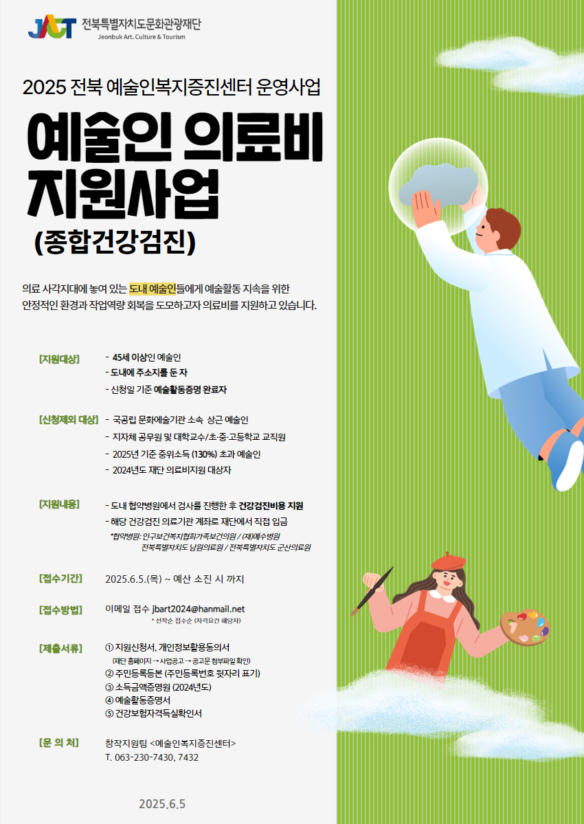 | 공모명 | 2025 예술인복지증진센터운영사업-예술인의료비(종합건강검진)지원사업 공고 |