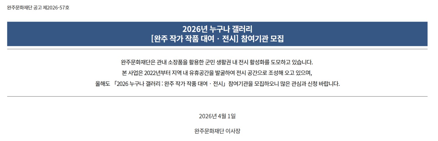 | 공모명 | 2026 누구나 갤러리 [완주 작가 작품 대여전시] 참여기관 모집 |
