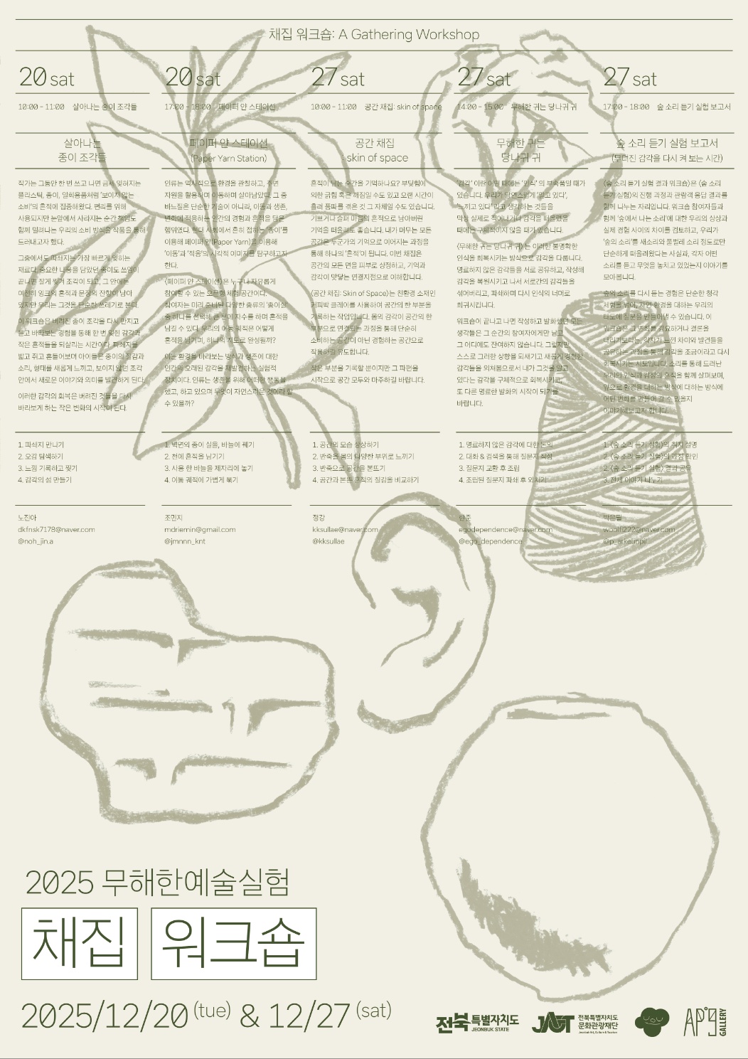 전시 《챱챱 툭툭 샥샥》은 ’ 오늘날 우리는 기후 변화를 감각하고 있는가? ‘ 라는 질문을 갖고, 채집이라는 방법으로 실험을 진행해, 인간과 자연의 관계 속 무뎌진 감각을 다섯 가지 워크숍을 통해 회복하고자 합니다.
