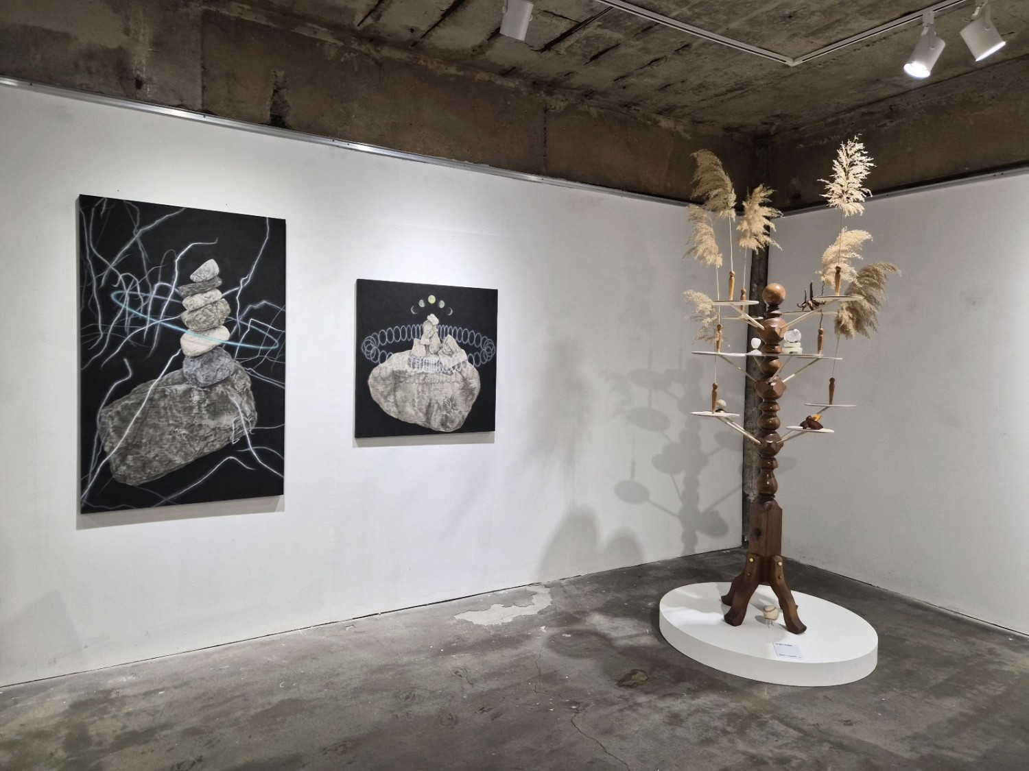 ○이번 전시에 참여한 작가들이 각자의 방식으로 이 ‘스탄차’를 시각화 하는데, 박해선은 사라져가는 사물의 파편과 사용을 다한 조각들을 다시 화면 위로 불러들이며, 사라질 것과 남겨질 것 사이의 행간을 포착한다. 손승범은 기념비적인 대상과 이름조차 없는 사소한 사물을 한 화면에 병치함으로써, 무엇이 기억되고 무엇이 잊히는지에 대한 질문을 던진다. 이은지는 아직 이름 붙지 못한 형상과 단정할 수 없는 ‘덩어리’를 통해, 의미가 고정되기 전의 유동적인 상태를 탐색한다. 차현욱은 과거와 현재, 예지된 미래의 장면을 하나의 화면에 겹쳐 놓는 회화를 통해, 시간의 균열과 그 사이에 놓인 행간을 드러낸다.