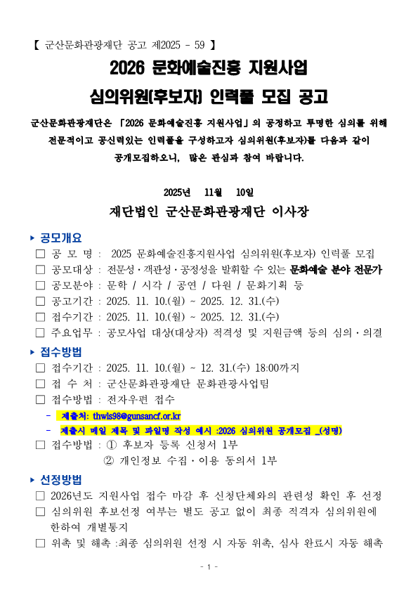 | 공모명 | 2026 문화예술진흥 지원사업 심의위원(후보자) 인력풀 모집 공고 |