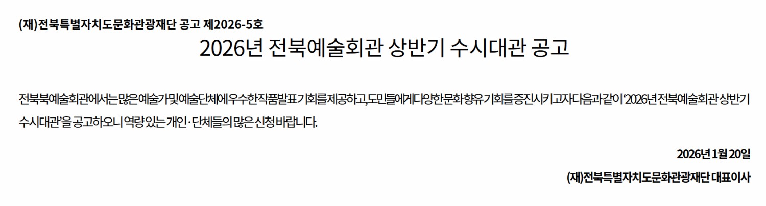 | 공모명 | 2026년 전북예술회관 상반기 수시대관 공고 |