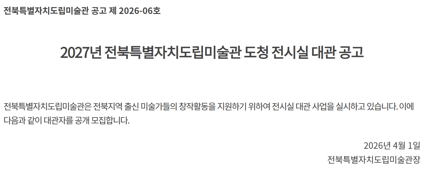 | 공모명 | 2027년 전북특별자치도립미술관 도청 전시실 대관 공고 |